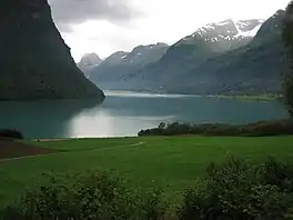 Oldevatnet is a lake in the municipality of Stryn in Vestland county, Norway. It is located in the valley of Oldedalen. The lake covers an area of 7.9 square kilometres (3.1 sq mi), and has a length of about 12 kilometres (7.5 mi). The river of Oldeelva flows from Oldevatnet via the lake of Floen to Innvikfjorden, a branch of Nordfjord.[1]