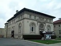 The library is a historic, built in 1909, with funds provided by the philanthropist Andrew Carnegie was one of 3,000 such libraries constructed between 1885 and 1919, and one of 107 in New York State. Carnegie provided $40,000 (equivalent to $1,206,000 in 2021) toward the construction of the Olean library. The building was designed by architect Edward L. Tilton in the Beaux-Arts style. The interior features a grand stairway and entrance, large rooms, and central atrium.[5] The Carnegie building was opened May 23, 1910 and a period of growth in the size and scope of the collection and patronage began almost immediately. It was listed on the National Register of Historic Places in 1985.[1]