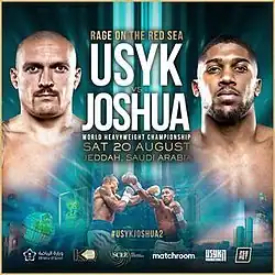 Oleksandr Usyk vs Anthony Joshua II, billed as Rage on the Red Sea, was a heavyweight professional boxing match between WBA (Super), IBF, WBO, and IBO heavyweight champion, Oleksandr Usyk, and former heavyweight champion, Anthony Joshua. The bout took place on 20 August 2022 at King Abdullah Sports City in Jeddah, Saudi Arabia.[1] Usyk won the 12-round bout by split decision, with scores of 116–112 and 115–113 in his favour, and 115–113 in favour of Joshua.[2]