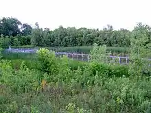 In the late 1940s, John D. Kraus set up OSU's first Radio telescope in the west campus farm fields next to Ackerman Run.[3] This was the first iteration of what would later be called the Big Ear. However, when more space was needed for an expansion, the project moved adjacent to Perkins Observatory in Delaware in 1961. Though the site has long since been abandoned, the ruins of the original control building and the antenna footings remain.