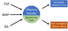 Placodes are transient, focal aggregations of ectoderm located in the developmental region of the future vertebrate head, and give rise to sensory organs.[11] Early cranial sensory placodes are marked by expression of Six1, part of the Six family of transcription factors that regulate preplacodal ectoderm specification.[12] The olfactory placode forms as two thickenings of non-neural region of embryonic ectoderm.[13] In mice, the olfactory placode derives from an anterior portion of the neural tube, ~9-9.5 days into development and not long after the closure of the neural plate.[9] Development of the olfactory placode requires the presence underlying neural crest-derived mesenchymal tissue.[12] The specification of the olfactory placode tissue involves signaling of multiple gene networks, beginning with signals from bone morphogenetic proteins (BMP), retinoic acid (RA), and fibroblast growth factor (FGF), specifically FGF8.[14] The resulting regulated downstream expression of transcription factors, such as Pax6, Dlx3, Sox2, and others, within the presumptive olfactory placode are crucial for sub-regionalization within the future olfactory epithelium and is responsible for the diversity of cells that compose the future epithelium.[9][12][15]