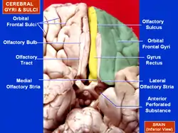 The olfactory tract and olfactory bulb lie in the olfactory sulcus[1] a sulcus formed by the medial orbital gyrus on the inferior surface of each frontal lobe. The olfactory tracts lie in the sulci which run closely parallel to the midline. Fibers of the olfactory tract appear to end in the antero-lateral part of the olfactory tubercle, the dorsal and external parts of the anterior olfactory nucleus, the frontal and temporal parts of the prepyriform area, the cortico-medial group of amygdala nuclei and the nucleus of the stria terminalis.[2]