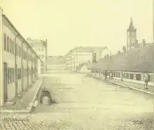 Olfert Fischers Gade traces its history back to Christian IV's foundation of Nyboder naval barracks in 1931 but different sections of it were then known under individual names. The section from Store Kongensgade was called Bryggerlængen (The Brewer Row), presumedly because a brewery was located at the site. The section from Borgergade to Adelgade was called Ulvegade (Wolf Street) and the section from Adelgade was called Balsamgade.[1] The streets in Nyboder were named after animals and plants. These two names followed Christian IV's decision to name the streets in the eastern part of Nyboder after animal species and the streets in the western part after plant species. The area was located outside the city until Copenhagen's East Rampart was moved in 1661. This had already been planned by Christian IV but had been delayed due to lack of funding.[2] Søetatens Hospital that replaced Søkvæsthuset, a naval hospital, was from 1806 located in Balsamgade. It closed in 1864. Nyboder's police station and jailhouse was located just around the corner in Adelgade. Adelgade then crossed the street a little further to the west, where Gammelvagt runs today, but the street was straightened in the 1990s.