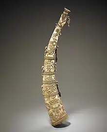 Olifant (also known as Oliphant) was the name applied in the Middle Ages to a type of carved ivory hunting horn created from elephant tusks.[1] Olifants were most prominently used in Europe from roughly the tenth to the sixteenth century, although some were created later.[2] The surviving inventories of Renaissance treasuries and armories document that Europeans, especially in France, Germany and England, owned trumpets in a variety of media and were used to signal, both in war and hunting. They were manufactured primarily in Italy (from either African or Indian elephant tusk), but towards the end of the fifteenth and early sixteenth centuries, they were also made in Africa for a European market.[1] Typically, they were made with relief carvings that showed animal and human combat scenes, hunting scenes, fantastic beasts, and European heraldry.[1] About seventy-five ivory hunting horns survive and about half can be found in museums and church treasuries, while others are in private collections or their locations remain unknown.[3]