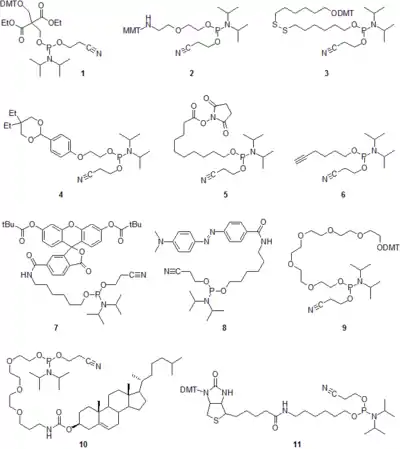 Non-nucleosidic phosphoramidites are used to introduce desired groups that are not available in natural nucleosides or that can be introduced more readily using simpler chemical designs. A very short selection of commercial phosphoramidite reagents is shown in Scheme for the demonstration of the available structural and functional diversity. These reagents serve for the attachment of 5'-terminal phosphate (1),[52] NH2 (2),[53] SH (3),[54] aldehydo (4),[55] and carboxylic groups (5),[56] CC triple bonds (6),[57] non-radioactive labels and quenchers (exemplified by 6-FAM amidite 7[58] for the attachment of fluorescein and dabcyl amidite 8,[59] respectively), hydrophilic and hydrophobic modifiers (exemplified by hexaethyleneglycol amidite 9[60][61] and cholesterol amidite 10,[62] respectively), and biotin amidite 11.[63]