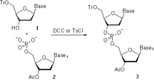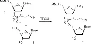 In the 1960s, groups led by R. Letsinger[22] and C. Reese[23] developed a phosphotriester approach. The defining difference from the phosphodiester approach was the protection of the phosphate moiety in the building block 1 (Scheme 4) and in the product 3 with 2-cyanoethyl group. This precluded the formation of oligonucleotides branched at the internucleosidic phosphate. The higher selectivity of the method allowed the use of more efficient coupling agents and catalysts,[24][25] which dramatically reduced the length of the synthesis. The method, initially developed for the solution-phase synthesis, was also implemented on low-cross-linked "popcorn" polystyrene,[26] and later on controlled pore glass (CPG, see "Solid support material" below), which initiated a massive research effort in solid-phase synthesis of oligonucleotides and eventually led to the automation of the oligonucleotide chain assembly.