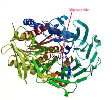 Short 'oligopeptides', predominantly smaller than 30 amino acids in length, play essential roles as hormones, in the surveillance against pathogens, and in neurological activities. Therefore, these molecules constantly need to be specifically generated and inactivated, which is the role of the oligopeptidases. Oligopeptidase is a term coined in 1979 to designate a sub-group of the endopeptidases,[8][13] which are not involved in the digestion nor in the processing of proteins like the pancreatic enzymes, proteasomes, cathepsins among many others. The prolyl-oligopeptidase or prolyl endopeptidase (POP) is a good example of how an oligopeptidase interacts with and metabolizes an oligopeptide. The peptide has first to penetrate into a 4 Å hole on the surface of the enzyme in order to reach an 8,500Å3 internal cavity, where the active site is located.[1][14] Even though the size of the peptide is crucial for its docking, the flexibility of both enzyme and ligand seems to play an essential role in determining whether a peptide bond will be hydrolyzed or not.[15][16] This contrasts with the classical specificity of proteolytic enzymes, which derives from the chemical features of the amino acid side chains around the scissile bond.[17] A number of enzymatic studies supports this conclusion.[15][18] This peculiar specificity suggests that the concept of conformational melding of the peptides used to explain the interaction between T-cell receptor and its epitopes,[19] seems more likely to describe the enzymatic specificity of the oligopeptidases. Another important feature of the oligopeptidases is their sensitivity to the oxidation-reduction (redox) state of the environment.[6][7] An "on-off" switch provides a qualitative change in peptide binding and/or degradation activity. However, the redox state only exerts strong influence on cytosolic enzymes (TOP[20][21] neurolysin[22][23] POP[24] and Ndl-1 oligopeptidase,[25][26] not on cytoplasmic membrane oligopeptidases (angiotensin-converting enzyme and neprilysin). Thus, the redox state of the intracellular environment very likely modulates the activity of the thiol-sensitive oligopeptidases, thereby contributing to define the fate of proteasome products, driving them to complete hydrolysis, or, alternatively, converting them into bioactive peptides, such as the MHC-Class I peptides.[16][27][28]