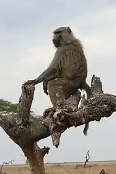 Throughout its wide range, the olive baboon can be found in a number of different habitats.[3] It is usually classified as savannah-dwelling, living in the wide plains of the grasslands.[13] The grasslands, especially those near open woodland, do make up a large part of its habitat, but the baboon also inhabits rainforests and deserts.[3] Uganda and the Democratic Republic of the Congo, for instance, both support olive baboon populations in dense tropical forests.[5]