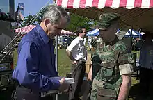 North unsuccessfully ran for the U.S. Senate seat held by Chuck Robb from Virginia in 1994. In a three-way race, North narrowly lost to Robb by a margin of 2.73%. He then hosted a talk show on Radio America from 1995 to 2003, and hosted War Stories with Oliver North on Fox News from 2001 to 2016. In May 2018, North was elected as president of the National Rifle Association. On April 27, 2019, he resigned amidst a dispute with the organization's chief executive Wayne LaPierre,[1] and was succeeded by Carolyn D. Meadows.[2]