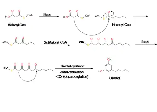 The data from Taura's study of OLS's enzyme kinetics show that OLS catalyzes a decarboxylative-aldol condensation to produce olivetol. This is similar to stilbene synthase's (STS) mechanism for converting p-coumaroyl-CoA and malonyl-CoA to resveratrol. Although olivetol is the decarboxylated form of OLA, it is highly unlikely that OLS produces olivetol from OLA.[10][11] Crude enzyme extracts prepared from flowers and leaves did not synthesize olivetolic acid, but only yielded olivetol.[10] The exact mechanism of olivetol biosynthesis is as yet unsure, but it is possible that an OLA-forming metabolic complex forms along with OLS.[10] In addition, it also appears that OLS only specifically accepts starter CoA esters with C4 to C8 aliphatic side chains such as hexanoyl-CoA.[10][12]
