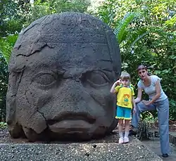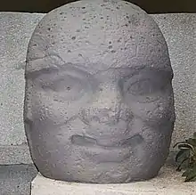 La Venta Monument 1 is speculated to have been the portrait of La Venta's final ruler.[114] Monument 1 measures 2.41 metres (7.9 ft) high by 2.08 metres (6.8 ft) wide by 1.95 metres (6.4 ft) deep; it weighs 24 tons.[115] The front of the headdress is decorated with three motifs that apparently represent the claws or fangs of an animal. Above these symbols is an angular U-shaped decoration descending from the scalp. On each side of the monument a strap descends from the headdress, passing in front of the ear. Each ear has a prominent ear ornament that descends from the earlobe to the base of the monument. The features are those of a mature man, with wrinkles around the mouth, eyes and nose.[116] Monument 1 is the best preserved head at La Venta but has suffered from erosion, particularly at the back.[117] The head was first described by Franz Blom and Oliver La Farge who investigated the La Venta remains on behalf of Tulane University in 1925. When discovered, it was half-buried; its massive size meant that the discoverers were unable to excavate it completely. Matthew Stirling fully excavated the monument in 1940, after clearing the thick vegetation that had covered it in the intervening years. Monument 1 has been moved to the Parque-Museo La Venta in Villahermosa.[115] The head was found in its original context; associated finds have been radiocarbon dated to between 1000 and 600 BC.[116]
