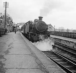 Following the grouping of 1923, the S&MJR became part of the London, Midland and Scottish Railway (LMS) which, in 1927, reintroduced passenger services between Olney and Towcester in the form of excursion trains on Towcester race days.[32][7][35] Although it used the line to provide a shorter route from the west to London than that offered by the Great Western Railway, the LMS did not increase the traffic carried on the S&MJR;[36] in the 1930s, the through goods services consisted of two booked down services and five up services of which three only ran when required.[37] The fastest services over the S&MJR were banana specials bound for St Pancras (Somers Town) from Avonmouth Docks.[24][9][38]