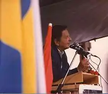 Palme was very popular among the left, but harshly detested by liberals and conservatives.[15] This was due in part to his international activities, especially those directed against the US foreign policy, and in part to his aggressive and outspoken debating style.[16][17]