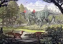 O. arharensis shared its time and place with several other types of animal, including two other lambeosaurines: the Parasaurolophus-like Charonosaurus and more basal Amurosaurus. Additionally, remains from turtles, crocodilians, theropods, and nodosaurids were found at its discovery site,[1] and the Saurolophus-like hadrosaurine Kerberosaurus is also known from roughly contemporaneous rocks in the area.[5] Unlike the situation in North America, where lambeosaurines are virtually absent from Late Maastrichtian rocks, Asian lambeosaurines are diverse and common at the end of the Mesozoic, suggesting climatic or ecological differences.[1]