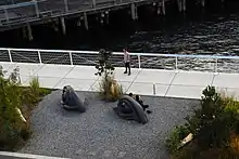 A $30 million gift from Mary and Jon Shirley established them as foundational donors.[9] As part of constructing the sculpture park, $5.7 million were spent transforming 1,000 feet (300 m) of the seawall and underwater shoreline inside Myrtle Edwards park. A three level underwater slope was built with 50,000 tonnes of riprap. The first level of the slope is large rocks to break up waves. The second is a flat "bench" level to recreate an intertidal zone. The lower level is covered with smaller rocks designed to attract sealife and large kelp. The aim for the recreated strand was to help revitalise juvenile salmon from the Duwamish River and serve as a test site for future efforts.[11]