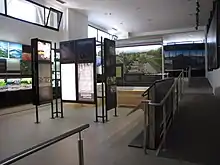 The design of the exhibition was designed by the Goulandris Museum of Natural History.[2] The exhibition is divided into seven areas, in which the peculiarities of the seven different zones of the mountain are presented, one will find large-sized boards that provide information about relevant topics in Greek and English. With every rise in the exhibition, the next higher altitude of the mountains is shown and the plant and animal world prevailing there is explained. Places of interest beyond nature are treated on separate boards, information about archaeological sites such as Dion or Leivithra is provided. The hiker is pointed out to interesting places near the hiking trails, such as the monastery of Agios Dionysius or the cave of the painter Ithakisios.