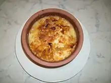 Om Ali, Omali, Umm Ali, or Oumm Ali (Egyptian Arabic: أم على), meaning "Mother of Ali", is a traditional Egyptian dessert, and is a national dessert of Egypt.[1] There are numerous variations with different composition.[2][3] The dish, which is traced back to as far as Medieval Egypt, it is named after the wife of the Sultan of Egypt who asked all Egypt's cooks and women to compete and come up with the most delicious dessert that they could create as a form of celebration. The chosen recipe was later distributed throughout the country to celebrate, and it is a national dish of Egypt and a traditional Egyptian dessert till this day.[4] It is commonly eaten during Ramadan as part of the iftar or sunset feast.