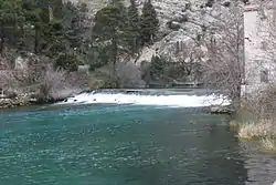 The hydrological regime of the basin and Popovo Polje is determined by the flow of the Trebišnjica—a losing stream disappearing underground in the polje.[18] The groundwater is distributed to a number of springs. Some of them are headwaters of watercourses discharging into the Neretva River to the northwest of the polje, or appearing as vruljas (submarine springs) or as headwaters of the Ombla river.[19] Flow rate of the Ombla River, measured at the Komolac water intake plant, ranges from 3.96 to 104 cubic metres (140 to 3,673 cubic feet) per second, averaging 24.1 cubic metres (850 cubic feet) per second. The average has dropped by about 10 cubic metres (350 cubic feet) per second since completion of Trebišnjica Hydroelectric Power Plant and the concreting of the Trebišnjica's river bed. On the other hand, the minimum discharge was not affected by the river engineering works.[20]