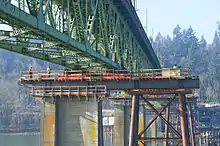 In January 2013, working with Multnomah County government, Omega Morgan moved the 6.8-million pound main 1,100-foot (340 m) section of the Sellwood Bridge in Portland, Oregon from its current location onto new pylons.[20] This move was part of the construction project to replace the bridge.[21] The move allowed for the old bridge section to be used as a detour route while the new bridge was constructed adjacent to the old span.[21] Omega Morgan used jacks and skids to move the section, as well as Dawn dish-washing detergent as a lubricant.[21] To match the newly built onramps, the bridge was moved 66 feet on its west end and 33 feet on its east end.[21] The moved bridge, known as a shoofly bridge,[22] served as a temporary span until the new crossing was completed in 2016.