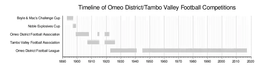 The Omeo District Football Association (ODFA) was formed in 1899, replacing the Noble Explosives Cup.[13] The competition ran under this name from 1899 to 1907, then from 1914 to 1921.[14] Clubs that competed in the ODFA over this time were Cassilis, Omeo, Benambra, Swifts Creek, and Ensay, although only Omeo played in every season that the ODFA was operational.[7] After a year's absence in 1922, the competition would relaunch in 1923 as the Omeo District Football League. Further discussion is included below on the interaction between the ODFA and the Tambo Valley Football Association during their overlapping years of operation between 1907 and 1921.