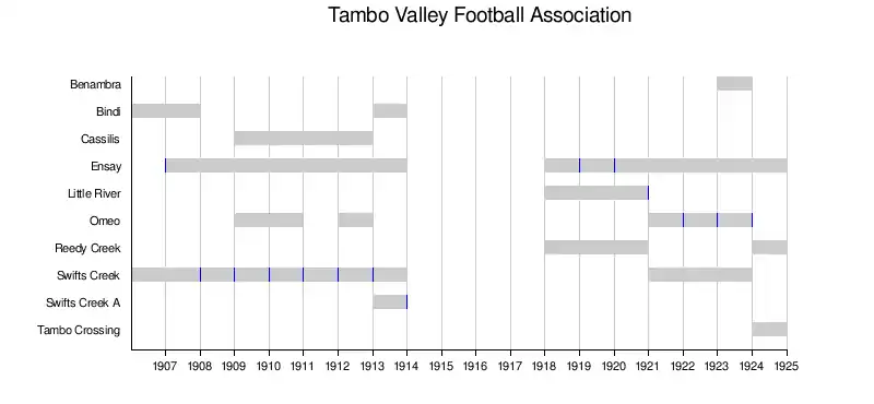 The mainstays of the early football competitions up to the ODFA were Swifts Creek and Omeo, with Long Gully/Cassilis, Benambra, and Ensay also fielding teams in some or most years. In 1907 the competition split into two branches. The ODFA continued as an 'above the gap' competition involving Omeo, Benambra, and Cassilis, while a new 'below the gap' competition, the Tambo Valley Football Association (TVFA), was formed by Swifts Creek, Ensay, and a new team from the small locality at Bindi.[7][8][15][16] At this time roads were poor and transport options limited, making the 70 km between Benambra and Ensay for example very significant, so presumably this split was largely to help with travel as the competition expanded to more clubs over a larger area.
