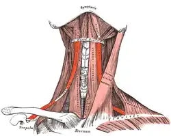 The omohyoid muscle is a muscle that depresses the hyoid. It is located in the front of the neck, and consists of two bellies separated by an intermediate tendon. The omohyoid muscle is proximally attached to the scapula and distally attached to the hyoid bone, stabilising it.[1] Its superior belly serves as the most lateral member of the infrahyoid muscles, located lateral to both the sternothyroid muscles and the thyrohyoid muscles.[2][3]