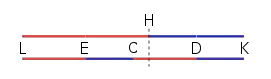 Therefore, as the ratio of LH to HK has doubled the original distances CD and EC, similarly divide the magnitudes A and B into a ratio of eight to six (a transformation that conserves their original ratio of four to three), and align them so that the A units (red) are centred on E, while the B units (blue) are centred on D.