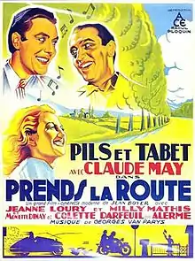 On the Road or Take the Road (French: Prends la route) is a 1936 French musical comedy film directed by Jean Boyer and starring Jacques Pills, Claude May, and Georges Tabet.[1] The same lead actors had also appeared together in You Are Me.