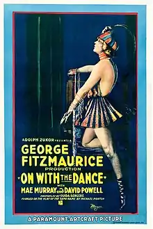 On with the Dance is 1920 American silent costume drama directed by George Fitzmaurice, starring Mae Murray and David Powell, and released by Paramount Pictures. The film is a screen adaptation of the 1917 Michael Morton play by the same name.[1][2]