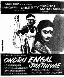 Ondru Engal Jaathiye..! (transl. One is our Caste..!) is a 1987 Indian Tamil-language film co-written and directed by Ramarajan. The film stars him and Nishanthi. It was released on 31 July 1987.