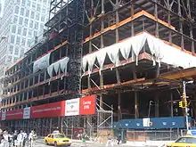 The building's spire was installed by December 15, 2007.[171] By mid-2008, the scaffolding over the facade of Henry Miller's Theater was being dismantled.[172] Several construction accidents occurred that year. In August 2008, a 1,500-pound (680 kg) glass panel fell onto a sidewalk, hurting two passersby.[173] The window had gotten stuck near the top of the tower while it was being pulled by a winch; this led the New York City Department of Buildings to issue three violations. A Tishman spokesman said 9,400 facade panels had already been installed at the time.[174] A month later, a debris container fell, shattering a facade panel and causing several shards of glass to fall to the street, though no one was injured.[175] Yet another incident occurred that November, when a worker fell from a scaffold and was injured.[176]