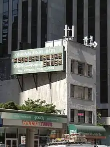 Seymour Durst erected the National Debt Clock on one building at the site in 1989.[113] By the next year, Seymour Durst had acquired 20 lots, including the Henry Miller Theater and the Hotel Diplomat.[16] Though Seymour Durst died in 1995, his son Douglas Durst continued to acquire land on the block, developing 4 Times Square on the western half in the late 1990s.[111] Douglas's daughter Anita convinced him to allow her arts organization chashama to temporarily use one of the empty storefronts on the site.[12] In 1998, the New York City and state governments offered to condemn the remainder of the block via eminent domain so Durst could acquire the lots and develop a headquarters for Nasdaq there.[114] The Bernsteins filed a lawsuit against New York state to prevent their land from being seized through eminent domain.[115] The Nasdaq plan was canceled the next year.[116]