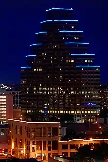 One Eleven Congress was designed by the architect Victor A. Lundy and HKS, Inc. along with an interior designed by Susman Tisdale Gayle Architects.[5] The building's facade is clad in red granite and bronze-tinted glass. Designed in a step-like pyramid shape, the tops of each "step" are lined in blue neon lighting, making the building a distinctive addition to the nighttime skyline. The lobby's ceiling is adorned in patterned Burmese teak. The building's parking garage, located across Brazos Street, is connected to the building via a tunnel and includes a Baylor Scott & White clinic on the ground floor.[5] On the north side of the building is a Wells Fargo bank branch with drive-thru lanes.