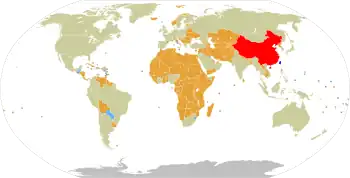 Countries recognizing the PRC only.Countries recognizing the ROC only.Countries recognizing the PRC, but have semi-formal relations with the ROC.Countries without reported relations with either the PRC or the ROC.