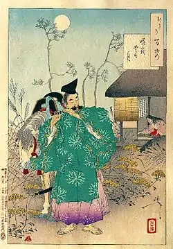 One Hundred Aspects of the Moon or Tsuki no Hyakushi (月百姿) in Japanese is a collection of 100 ōban size ukiyo-e woodblock prints by Japanese artist Tsukioka Yoshitoshi printed in batches, starting in 1885 until 1892.[1] It represents one of Yoshitoshi's later works. The woodblock prints feature various famous figures, both historical and literary characters, each in a moonlit scene as well as occasional references to poetry.