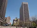 One M&T Plaza is an office tower located in Buffalo, New York and home to M&T Bank in Erie County. The 21-story International style or New Formalist[2] office tower was designed by Minoru Yamasaki with Duane Lyman Associates and completed in 1967.[1] The structural steel for the building was produced locally by Bethlehem Steel, and was a product of their V50 grade.[3] The base of the building is composed of white and green marble with an interior of travertine. The building also features a 75-by-225 foot exterior plaza.