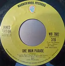 "One Man Parade" is a song written by James Taylor that was first released as the first track on his 1972 album One Man Dog. It was also released as the second single from the album, following up on the Top 20 hit "Don't Let Me Be Lonely Tonight," after receiving significant airplay as an album track.[1] The single was issued twice with two different B-sides, "Hymn" and "Nobody But You."[2] It did not achieve the same chart success as "Don't Let Me Be Lonely Tonight," peaking at #67 on the Billboard Hot 100.[3][4] It also charted on the Adult Contemporary chart in Canada, reaching #55.[5] In some regions, such as in Europe, it was released as the B-side of the single release of "One Morning in May."