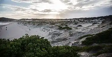 One Mile Beach, after which the area was named, is a family-friendly surf beach that is popular with tourists while Samurai Beach is accessible only by off-road vehicles and is clothing optional. Both beaches, like a large percentage of the locality, lie within the Tomaree National Park. The beaches form most of the coastline of Anna Bay which gave the adjacent suburb of Anna Bay its name.[7] The beach has a Surf Club, kiosk, barbecue and picnics area as well as public amenities.[8]