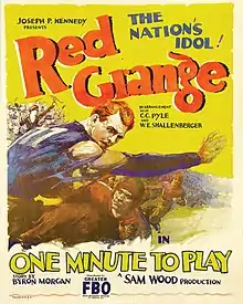In 1925, as one of college football's biggest names, Red Grange considered entering the acting business in addition to playing professional football. Later in the year, he joined the National Football League's Chicago Bears for a barnstorming tour; between games in December, agent C. C. Pyle showed off a movie check worth $300,000 as a publicity stunt.[4] The next day, The New York Times reported the Arrow Production Company had picked up the check, though Grange revealed in his 1953 autobiography that he really only received $5,000 per week for the film.[5][6] On December 11, while Grange was nursing a severe arm injury he had suffered in a game earlier in the day, the Motion Picture Owners' Association of America announced Grange's film might be barred from airing in association-operated theaters if the check bounced.[7]