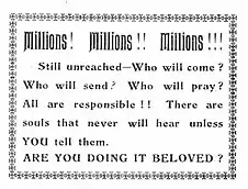 After moving to Chicago, they heard A.B. Simpson, founder of the Christian and Missionary Alliance, give a missionary challenge. They then decided to dedicate their lives to missionary work and trained at Martin Wells Knapp’s God’s Bible School in Cincinnati.[5]