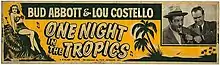 One Night in the Tropics is a 1940 comedy film which was the film debut of Abbott and Costello. They are listed as supporting actors but have major exposure with five of their classic routines, including an abbreviated version of "Who's on First?" Their work earned them a two-picture deal with Universal, and their next film, Buck Privates, made them bona fide stars. Songs in the film were by Jerome Kern with lyrics by Dorothy Fields. The film is based on a 1914 novel, Love Insurance by Earl Derr Biggers, the creator of Charlie Chan.[2]
