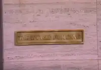 Left, sign on front of building labeling the fictional "World Building", the setting of fictional oil company "World Oil".