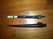 A one-hitter[1] (also oney, bat, tay, oney bat, or taster) is typically a slender pipe with a screened narrow bowl designed for a single inhalation, or "hit", of smoke or vapor from a small serving (about 25 mg) of heated cannabis flower, tobacco leaf or other dry, sifted herbal preparation.[2] It is distinguished from western-style large-bowl pipes designed for strong tobaccos that are burned hot and tasted but not inhaled. Instead, by properly distancing a lighter flame below the opening, inhalant users operate at vaporization temperatures, minimizing combustion waste and toxicity.[3][4]
