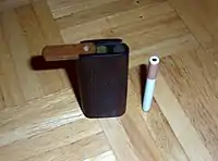 Modern adaptations from craft-centric companies use fine and rare woods, bone, acrylic, aluminum, steel, titanium, other metals or plastics, adding features such as grinders, poker storage or lighter chambers. Carried in a shirt pocket, they are the tangible "replacement" for a pack of cigarettes when one is eliminating a smoking habit.[7]