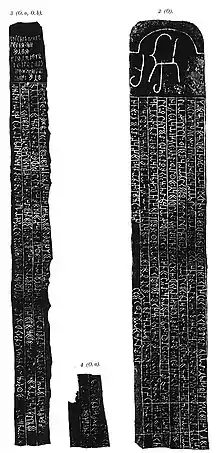 The Ongin inscription was discovered in 1891 in Mongolia near the Ongi River, 160 km south of the Orkhon inscriptions and 402 km south-west of the Tonyukuk inscriptions.[1]: 177 It was erected in honor of El Etmish Yabgu. Line 12 makes it clear that the author of the inscription erected a memorial to his father.[1]: 183 According to Gerard Clauson, it must have been erected between 716 and 735, during the reign of Bilge Qaghan.[1]: 191 According to Ercilasun it was erected in 719 or 720.[2]