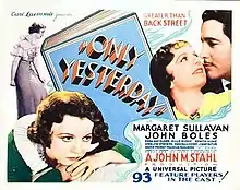 Only Yesterday is a 1933 American pre-Code drama film about a young woman who becomes pregnant by her boyfriend before he rushes off to fight in World War I. It stars Margaret Sullavan (in her film debut) and John Boles.