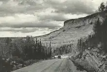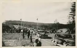 From the east, construction proceeded at a similar pace, although through much more barren expanses of forests and lakes. By the end of 1932, construction had proceeded from Thunder Bay through Upsala to English River. A 75 mi (121 km) gap was all that remained, between Dyment and English River.[11] On June 4, 1934, crews cleared the last section of forest separating Thunder Bay from Winnipeg.[15] However, it would require another year of rock blasting and construction to make the route navigable by vehicles. On July 1, 1935, a multi-day motorcade celebration was held to officially open the new highway. A convoy of vehicles travelled from Thunder Bay to Winnipeg along the route, resting overnight in Kenora before completing the two-day journey.[16][17]