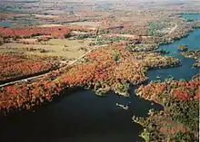 North of Lindsay, Highway 35 travels near the Trent–Severn Waterway, tracing its route alongside Sturgeon Lake, Cameron Lake and Balsam Lake.[14] It passes over the first of several limestone cuestas near the Ken Reid Conservation Area as it approaches the boundary between the Ordovician limestone and the Precambrian Canadian Shield.[15][16] The route curves northeast and travels through farmland as well as the community of Cameron, before turning back northward at Powles Corners, where it intersects the southern end of former Highway 121 (now Kawartha Lakes Road 121). It continues north a short distance to intersect Kawartha Lakes Road 8, the eastern leg formerly being Highway 35A into Fenelon Falls.[5][17][18] The highway curves around the southern end of Cameron Lake near Isaacs Glen, travels north for a brief period then zig-zags northeast through Rosedale,[19] where it crosses the Trent–Severn on the Constable Randall F. Skidmore Bridge, named after a local police officer who was involved in a fatal crash nearby on February 14, 1986.[20] The farmland alongside the highway thins out north of Rosedale, as the route makes its approach to Coboconk.[5]