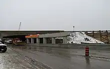 Construction began north of Barrie in April 2013 to replace the overpass at the Crown Hill junction with Highway 11.[51] The new structure, designed to accommodate future highway expansion, was completed in October 2015. The original overpass, built during the 1950s, was demolished during an overnight closure on December 13, 2015. The overall cost of this project was C$8.5 million.[52][53]