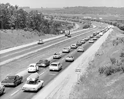 Highway 400, along with Highway 401 and Highway 402, was one of the first modern freeways in Ontario. Planning for the Toronto–Barrie Highway, which would become Highway 400, began in 1944.[1] The two routes connecting Barrie with Toronto at the time, Highway 11 and Highway 27, were becoming congested. Grading on a new alignment between Weston Road and Jane Street was completed from Wilson Avenue to Highway 27 (Essa Road) by 1947.[3] The onset of the Korean War slowed construction on the highway considerably,[14] and it wasn't until December 1, 1951 that two lanes (one in each direction) would be opened to traffic. All four lanes were opened to traffic on July 1, 1952, at which point the highway was designated Highway 400.[15] The name was the scorn of one newspaper editor, who published his distaste for using numbers to name a highway.[16] The freeway featured a 9.1 m (30 ft) grass median.[17]